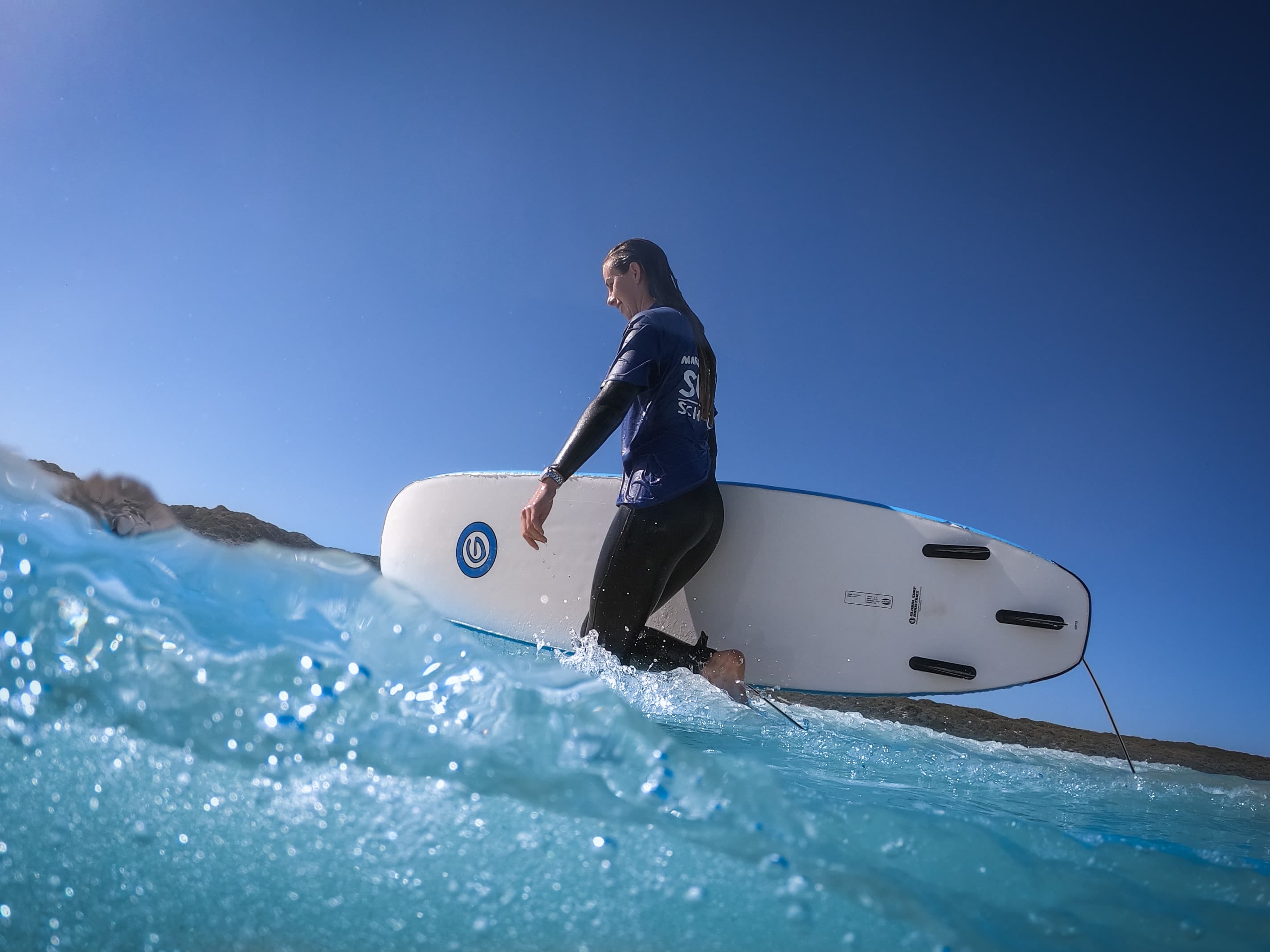 Man fishing on a sandy beach with a fishing rod, facing the blue ocean under a clear sky. Rocky coastline visible in the background.